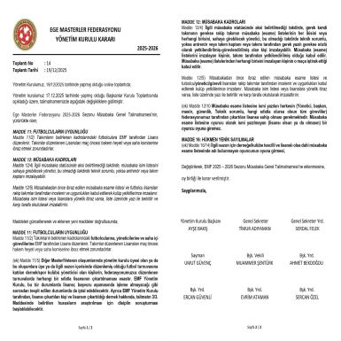 Yönetim Kurulumuzun yapmýþ olduðu toplantýda aldýðý karar neticesinde; EMF 2025-2026 Sezonu Müsabaka Genel Talimatý'nda yapýlan deðiþiklikler, 19 Aralýk 2025 tarihinde tüm takýmlarýmýza tebliðen duyuruldu.
