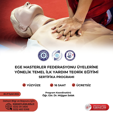 Ege Üni. Sürekli Egitim Merkezi tarafindan, sporcu yaralanmalarina hizli ve dogru müdahale için 26 - 27 Eylül 2024 tarihlerinde (2 gün) ücretsiz, yüz yüze temel ilk yardim teorik egitimi verilecektir.