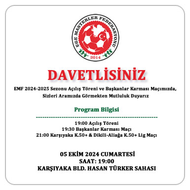 05 Ekim 2024 Cumartesi günü saat 19:00 'da Karsiyaka Belediyesi Hasan Türker Sahasinda gerçeklesecek olan EMF 2024-2025 Sezonu Açilis Töreni ve Baskanlar Karmasi Maçimizda, Sizleri Aramizda Görmekten Mutluluk Duyariz.