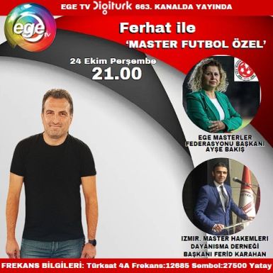 Ege Masterler Federasyonu Baskani Ayse BAKIS’in canli yayin konugu olarak katilacagi "Ferhat ile Master Futbol Özel" programi 24 Ekim Persembe aksami, saat 21.00’de EgeTv’de yayinlanacaktir.